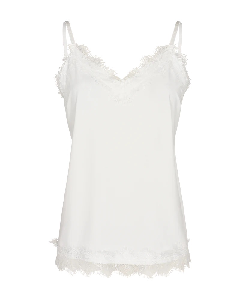 Mouwloze top van Freequent met een V-hals, kanten details en verstelbare spaghettibandjes. Materiaal: Polyester 95%| elastan 5%
