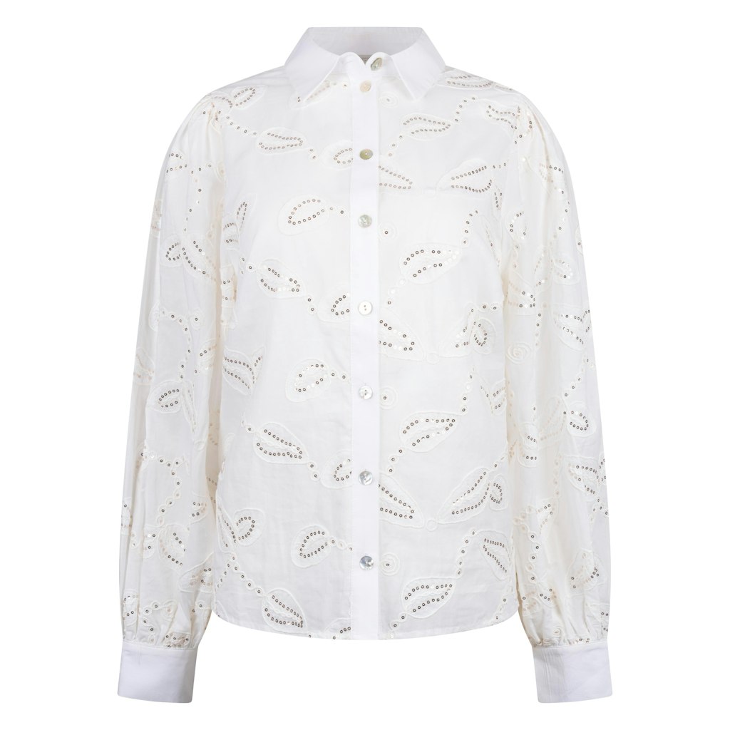 Geborduurde blouse van Nukus voorzien van subtiele pailletten met lange pofmouwen, kraag en een knoopsluiting. Materiaal: Katoen 100%