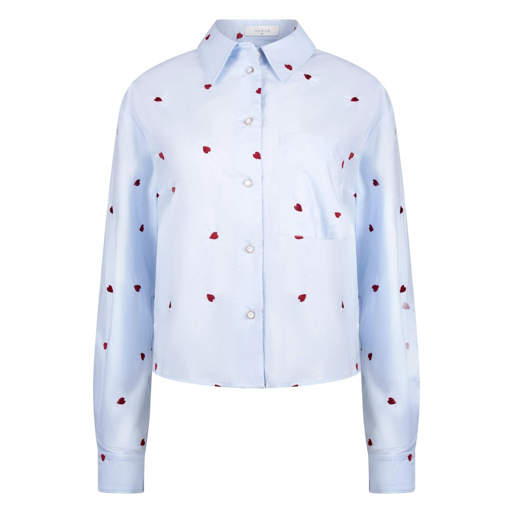 Blouse van Nukus met een charmante hartjes print, lange mouwen, kraag, knoopsluiting en een opgestikte borstzak. Materiaal: Katoen 100%