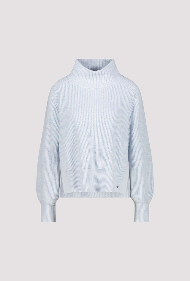 Trui van Monari in een ribstructuur met lange mouwen, opstaande kraag, zijsplitten en een iets langere achterzijde. Materiaal: Katoen 60%| acryl 40%