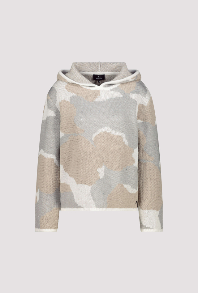 Gebreide trui van Monari in een wolken patroon voorzien van pailletten met lange mouwen, capuchon en smalle ribgebreide boorden.
