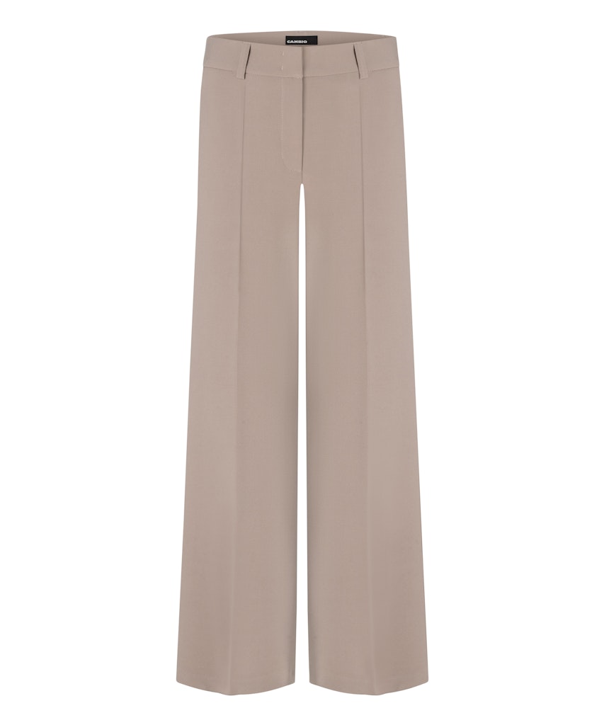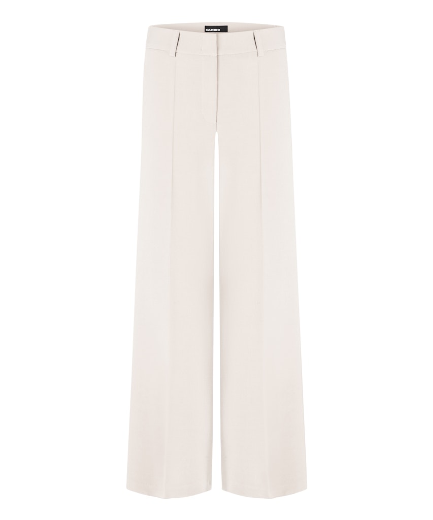Broek van Cambio met wijde pijpen, knoop- en ritssluiting, steekzakken en twee paspelzakken aan de achterzijde. Materiaal: Polyester 90%| polyurethaan 10%