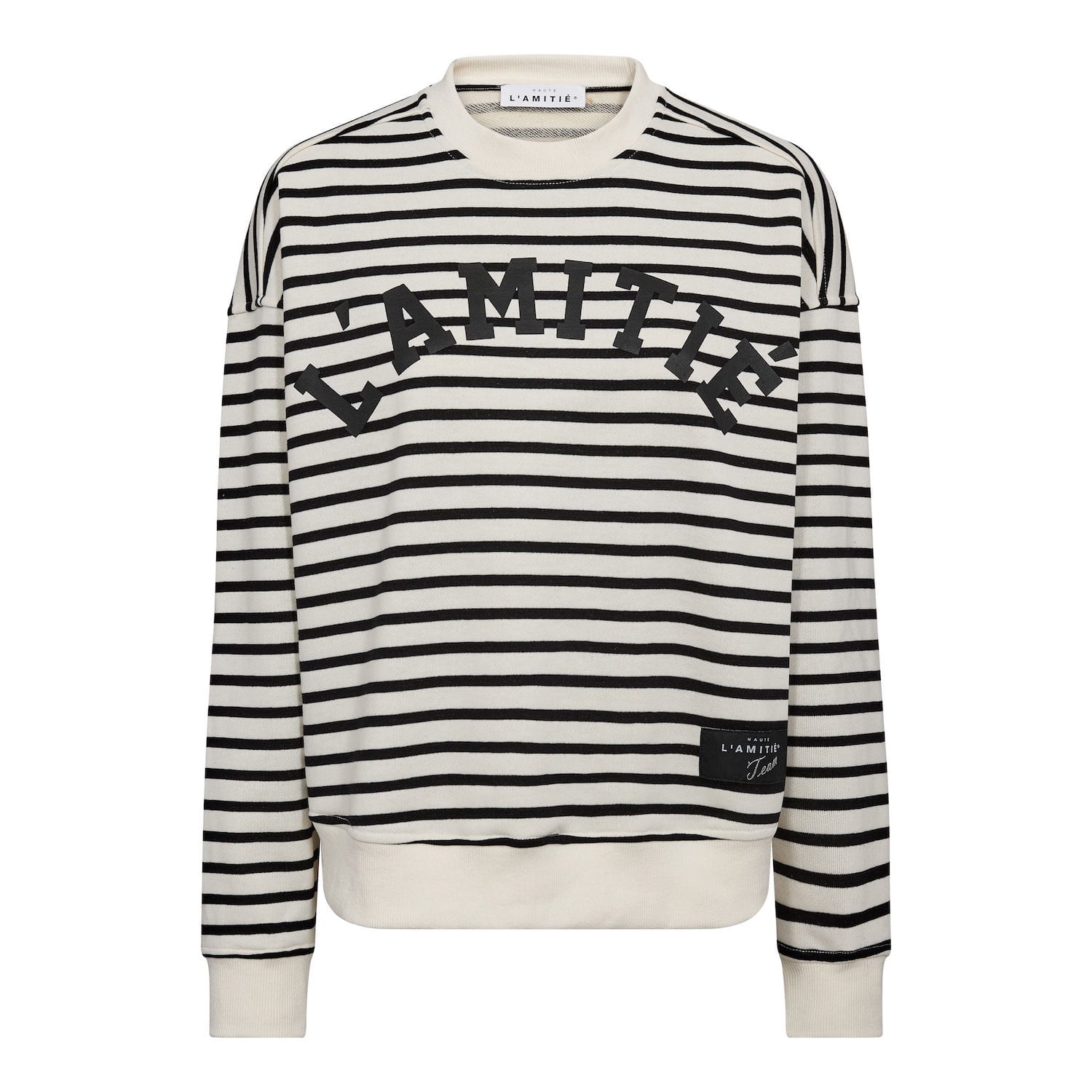 Gestreepte trui van Haut l'amitié met lange mouwen, verlaagde schoudernaden, ronde hals, logoprint op de borst en ribgebreide boorden. Materiaal: Polyester 70%| katoen 30%