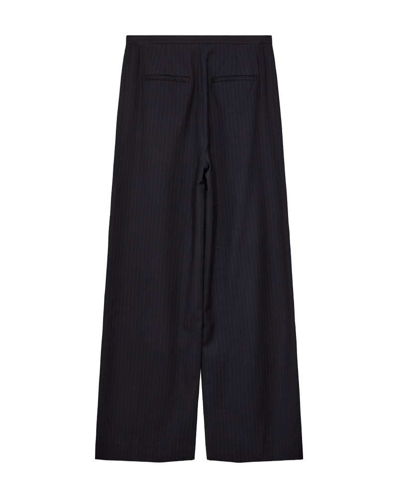 Krijtstreep broek van Cphn Muse met wijde pijpen, verborgen haak-en-oogsluiting, twee steekzakken en een hoge taille. Materiaal: Polyetser 70%| viscose 20%| wol 10%