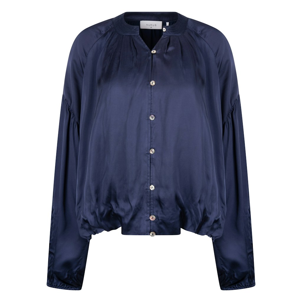 Soepelvallende blouse van Nukus met lange mouwen, verlaagde schoudernaden, ronde hals, knoopsluiting en geplooide details. Materiaal: Viscose 100%