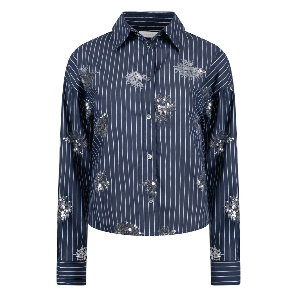 Gestreepte blouse van Nukus met pailletten, lange mouwen, verlaagde schoudernaden, kraag en knoopsluiting.