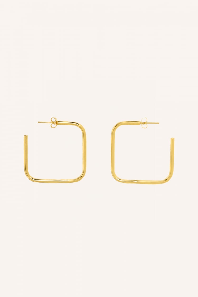 Goudkleurige squared oorbellen van By-bar gemaakt van nikkelvrij koper met een laagje 22K verguld goud. Diameter 3,9 cm.
