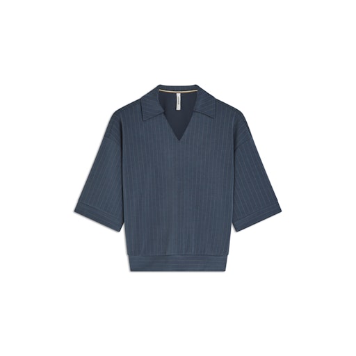 Krijtstreep top van Summum in scuba kwaliteit met een boxy fit, halflange mouwen en polokraag voorzien van V-uitsnede.