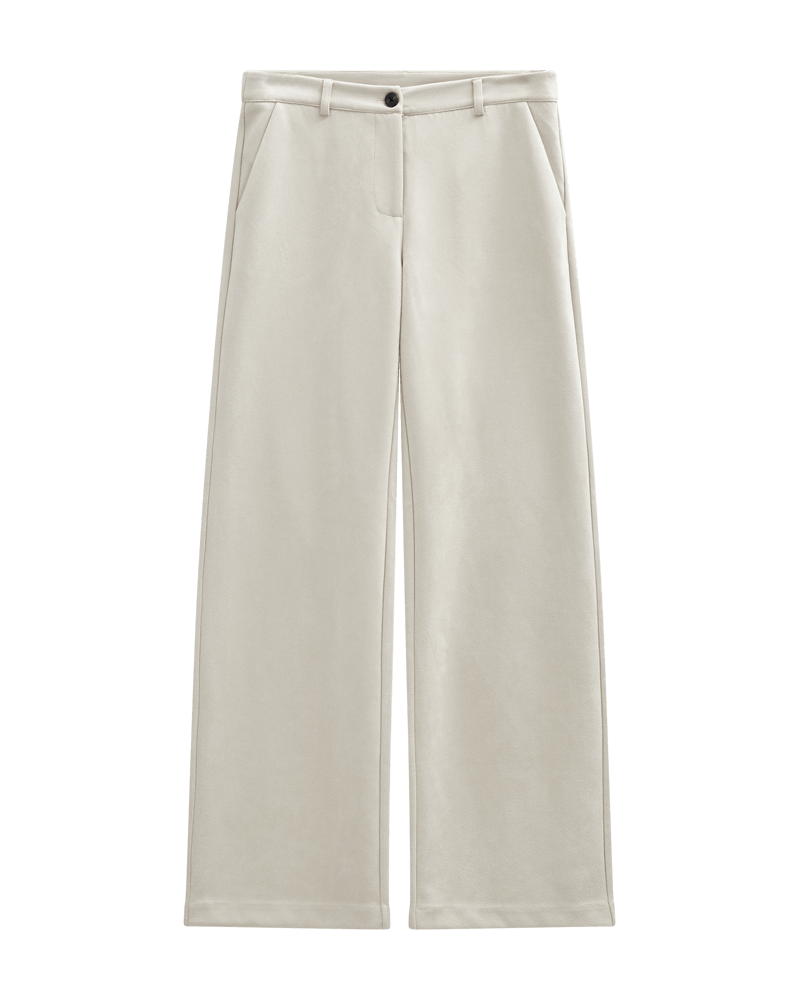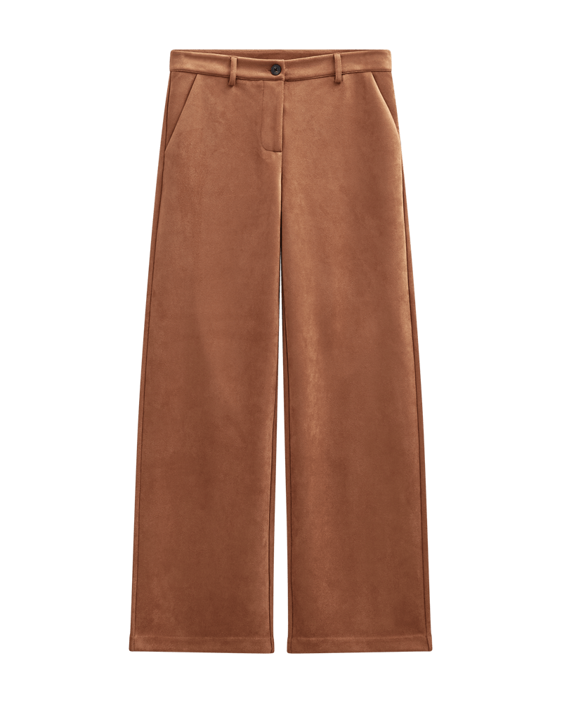 Broek van Freequent in suedelook met rechte pijpen, knoop- en ritssluiting, steekzakken en paspelzakken aan de achterzijde.