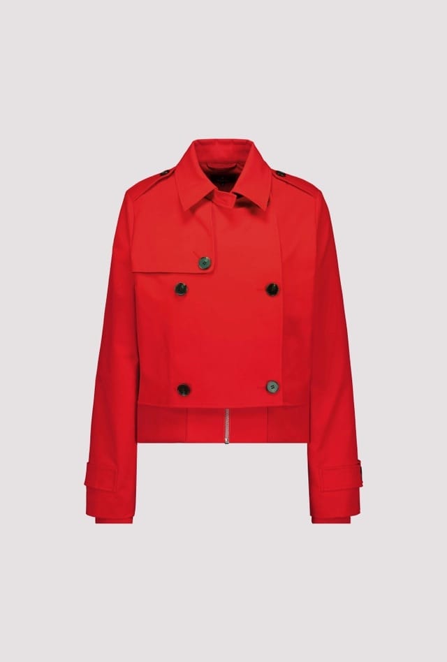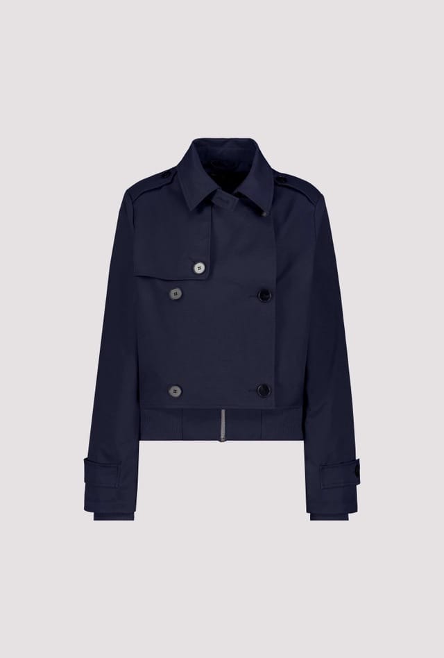 Korte trenchcoat van Monari met een double-breasted knoopsluiting, ritssluiting, kraag voorzien van gesp, ribgebreide boorden en epauletten op de schouders en mouwen.