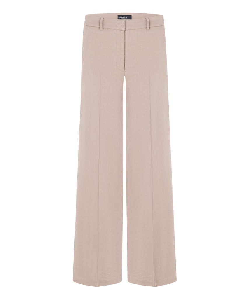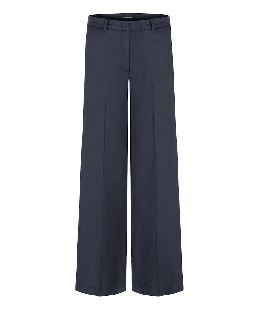 Linnen broek van Cambio met wijde pijpen, verborgen knoop- en ritssluiting, steekzakken en twee paspelzakken aan de achterzijde.