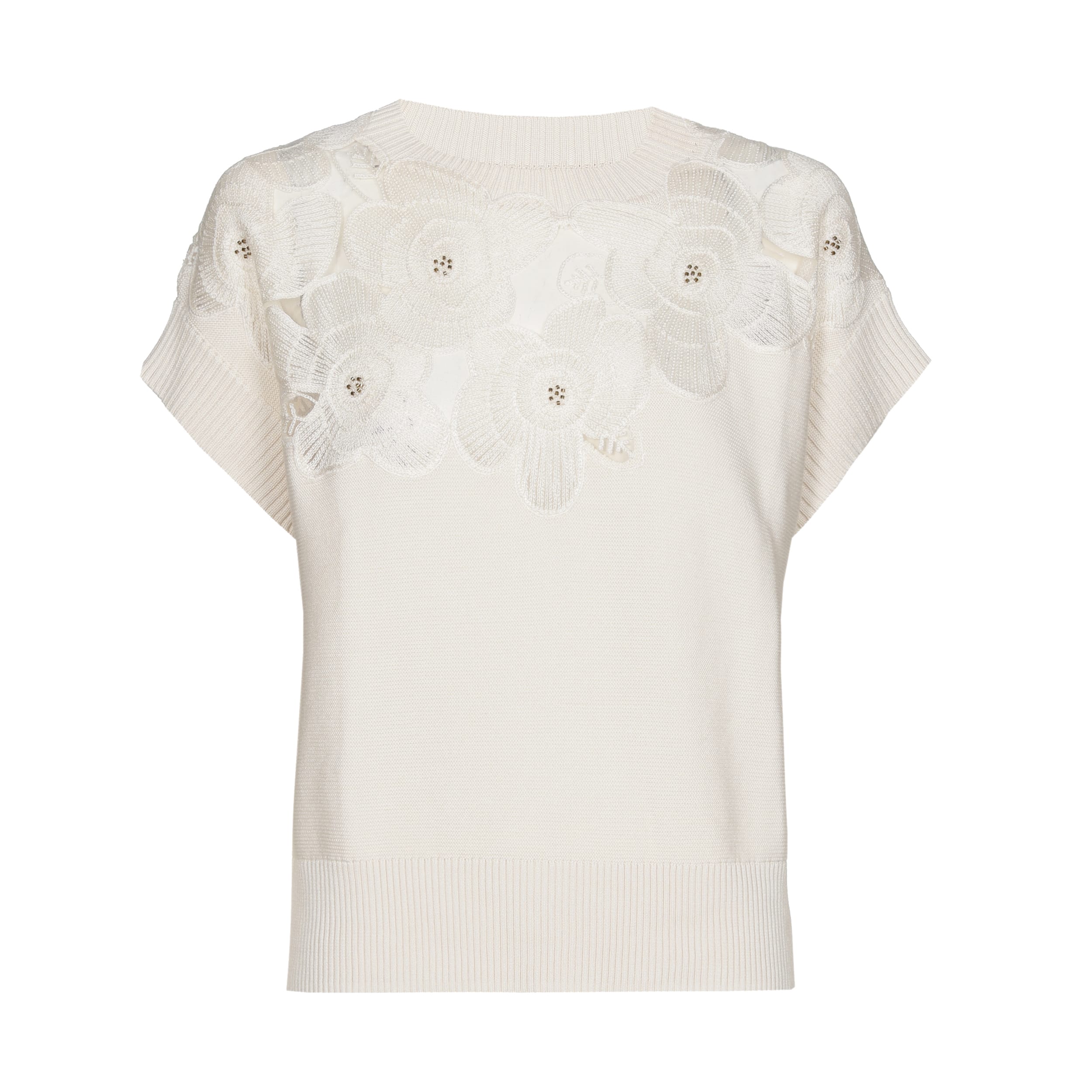 Fijngebreide trui van Caroline Biss met bloemdetail aan de voorzijde, korte mouwen en ribboorden. Materiaal: Katoen 46%| modal 46%| acryl 8%