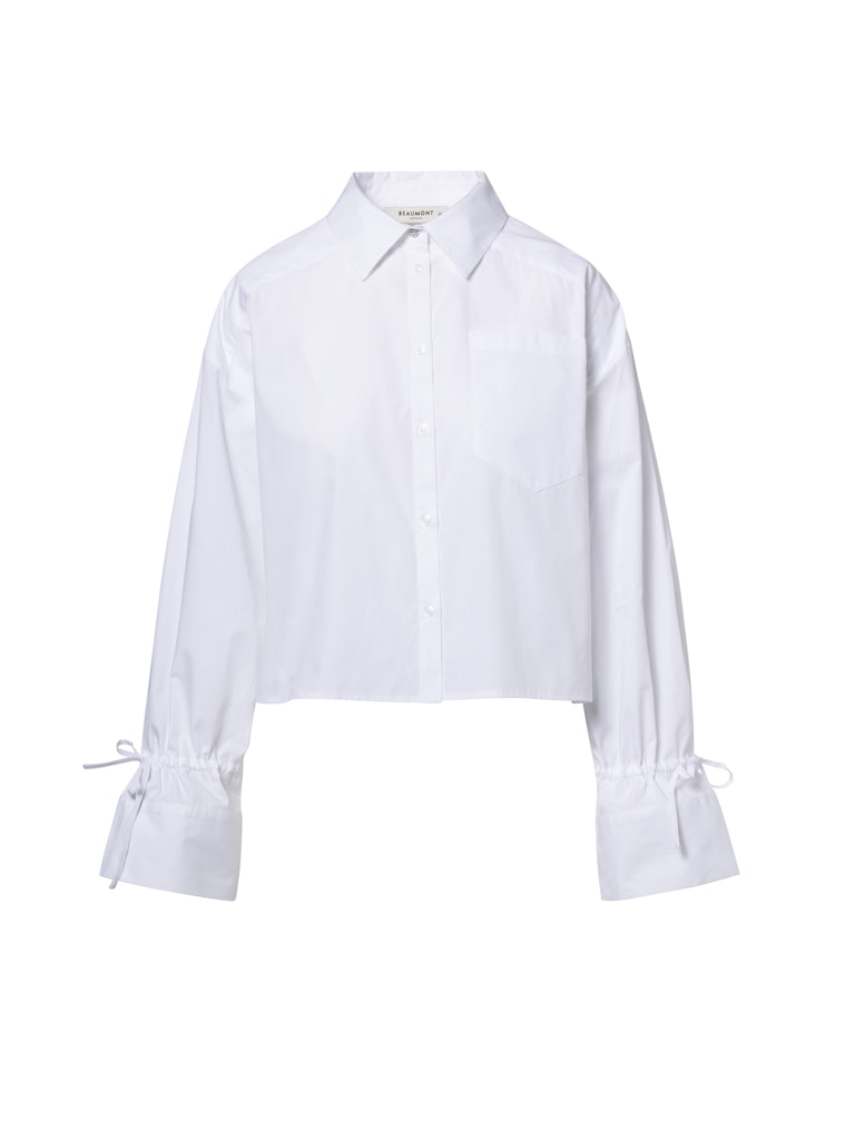Boxy blouse van Beaumont met lange mouwen voorzien van trekkoord, kraag, knoopsluiting, opgestikte borstzak en plooi aan de achterzijde. Materiaal: Organic katoen 100%