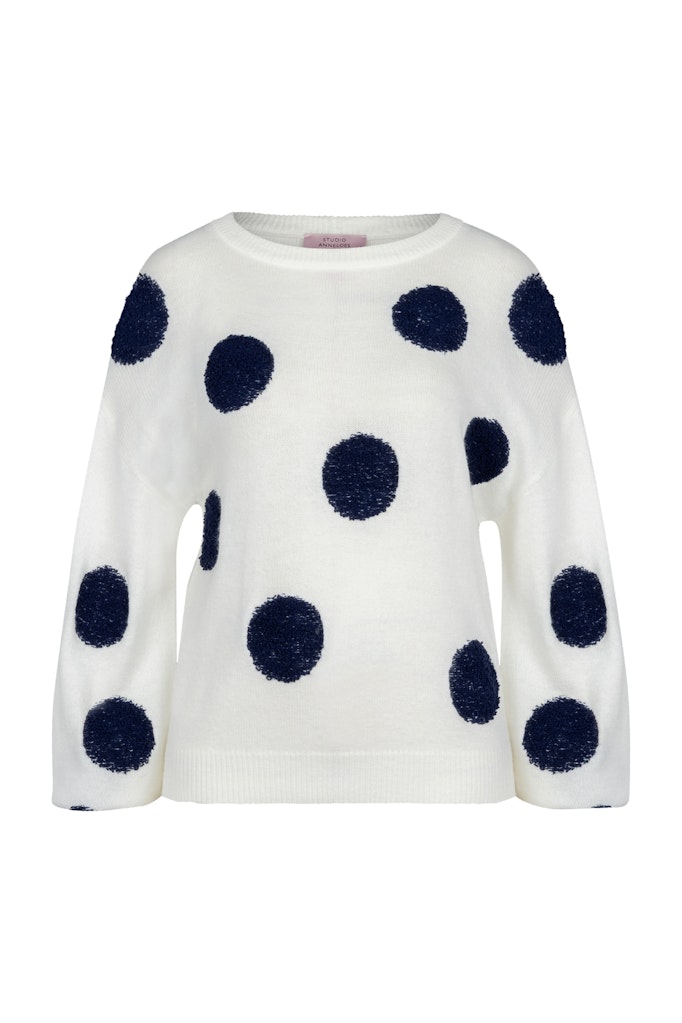 Pullover van Studio Anneloes met stippen dessin, lange pofmouwen, verlaagde schoudernaden, ronde hals en ribboorden. De grote stippen zijn met een speciale techniek aangebracht, waardoor ze voelbaar en licht verhoogd zijn. Materiaal: Acryl 58%| polyamide 42%