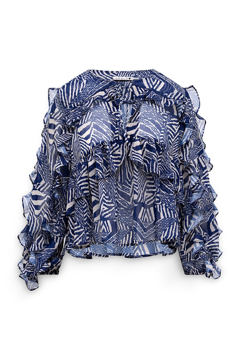 Semi transparante blouse van Label Dot in een grafisch dessin met volants en ruches, lange mouwen afgewerkt met ruches en elastische boorden en een ronde hals met cut-outdetail voorzien van striksluiting. Materiaal: Polyester 100%