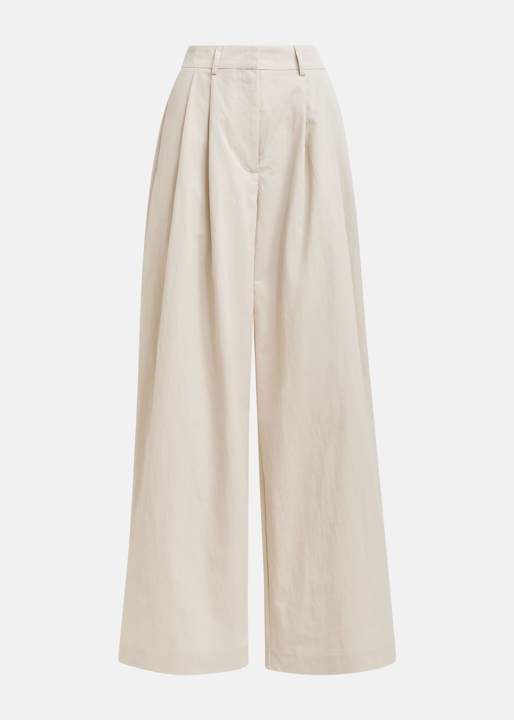 Broek van Essentiel Antwerp in een katoenmix met weldoordachte plooien in de taille die overgaan in soepel vallende brede pijpen. Hij is afgewerkt met twee paspelzakken achteraan, schuine steekzakken vooraan en een rits- en haaksluiting.