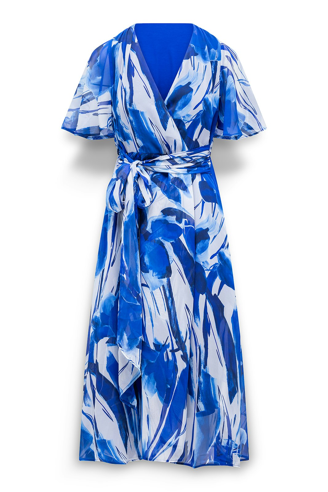 Voile overslagjurk van Label Dot in een all-over dessin met korte volantmouwen en brede linten in de zijnaden die je kunt strikken. Materiaal: Polyester 100%