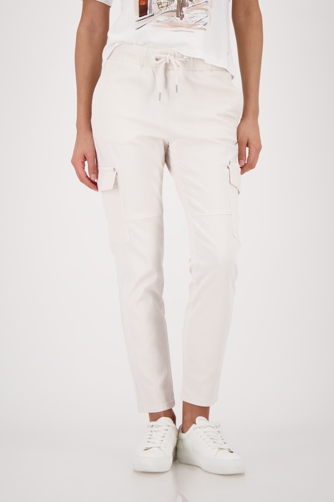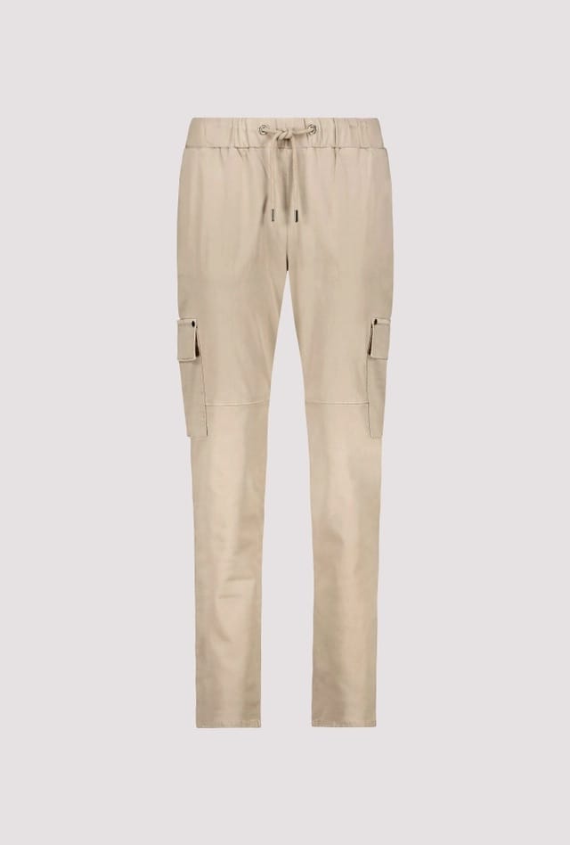 Cargobroek van Monari met steekzakken, klepzakken op de zijnaden, twee paspelzakken aan de achterzijde en een elastische tailleband voorzien van trekkoord. Materiaal: Lyocell 60%| katoen 37%| elastan 3%