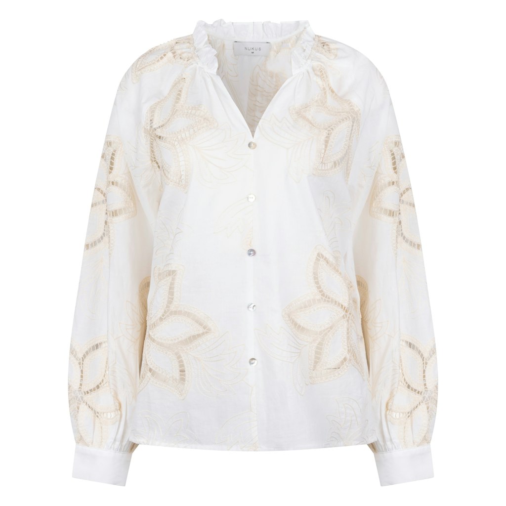Blouse van Nukus voorzien van opengewerkte embroidery bloemen met lange raglanmouwen, opstaande kraag, V-hals en een knoopsluiting. Materiaal: Katoen 100%