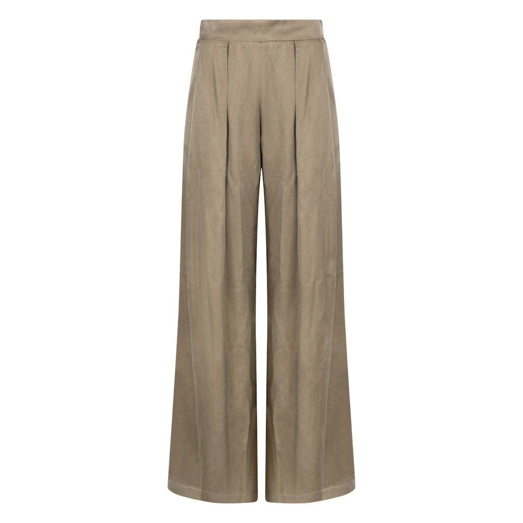 Soepelvallende broek van Nukus met extra wijde pijpen, bandplooien, steekzakken en een elastische tailleband aan de achterzijde. Materiaal: Polyester 60%| viscose 40%