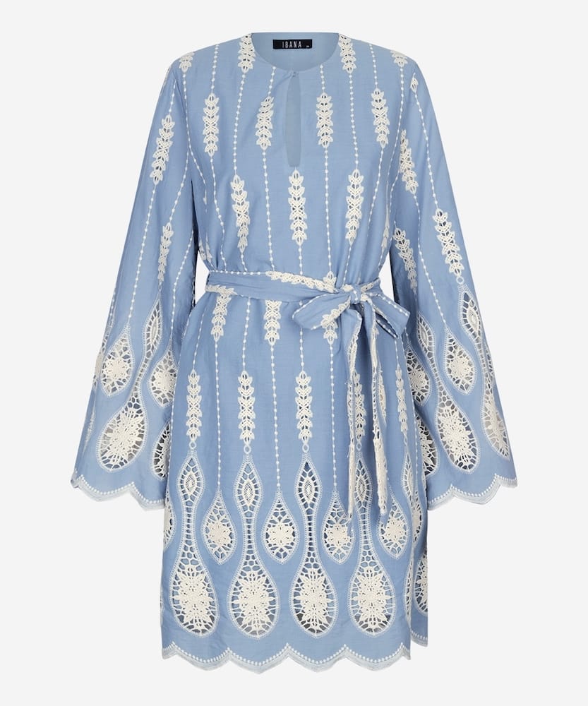 Elegante jurk van Ibana in een luchtige broderie stof met uitlopende lange mouwen, ronde hals voorzien van split en een strikceintuur in de taille.