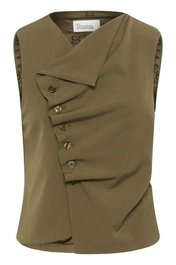 Mouwloze getaileerde top van My Essential Wardrobe met asymmetrische knoopsluiting en moderne drapering