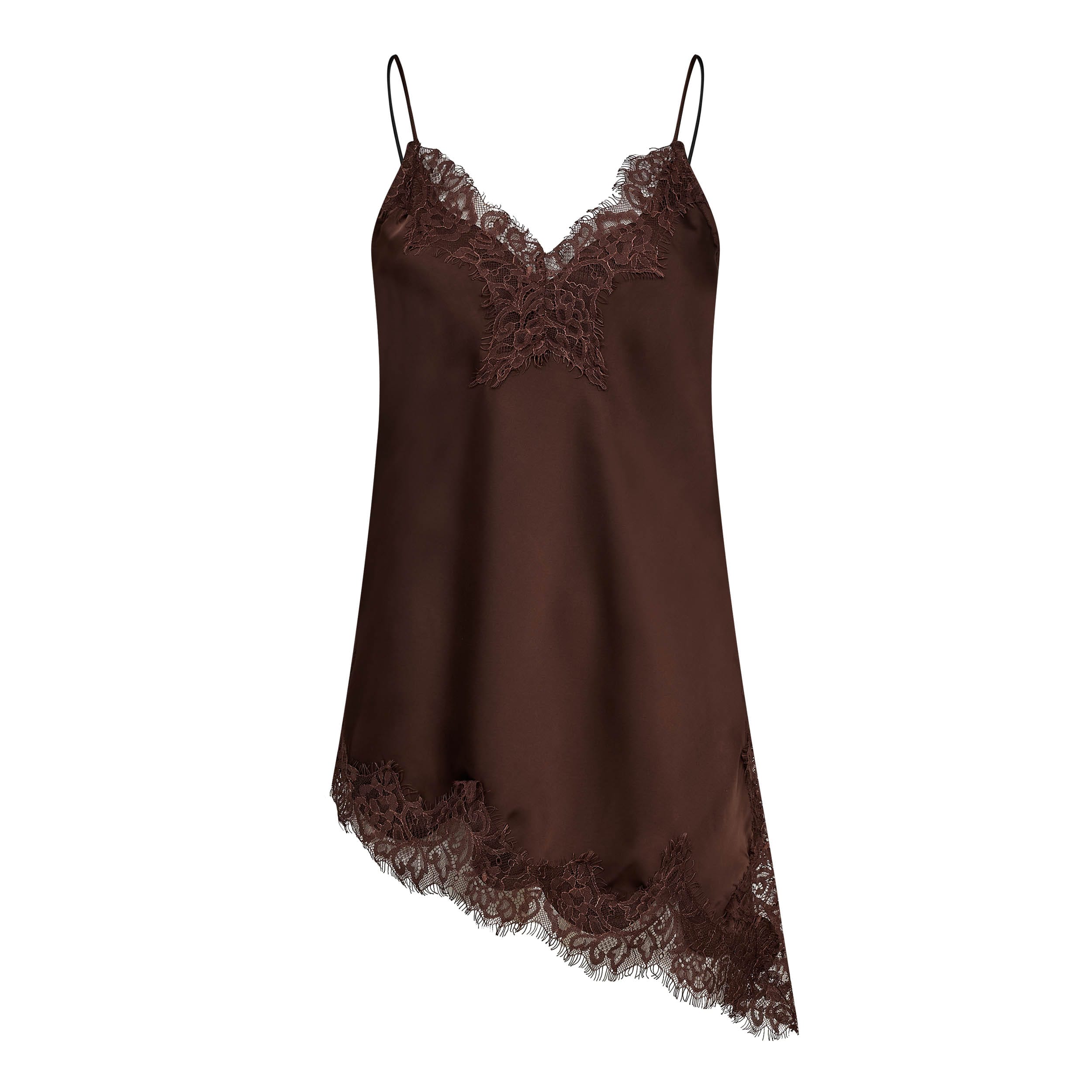 Mouwloze top van Haut l'amitie met kanten detals, V-hals, dunne spaghetti bandjes en een asymmetrische zoom. Materiaal: Polyester 100%