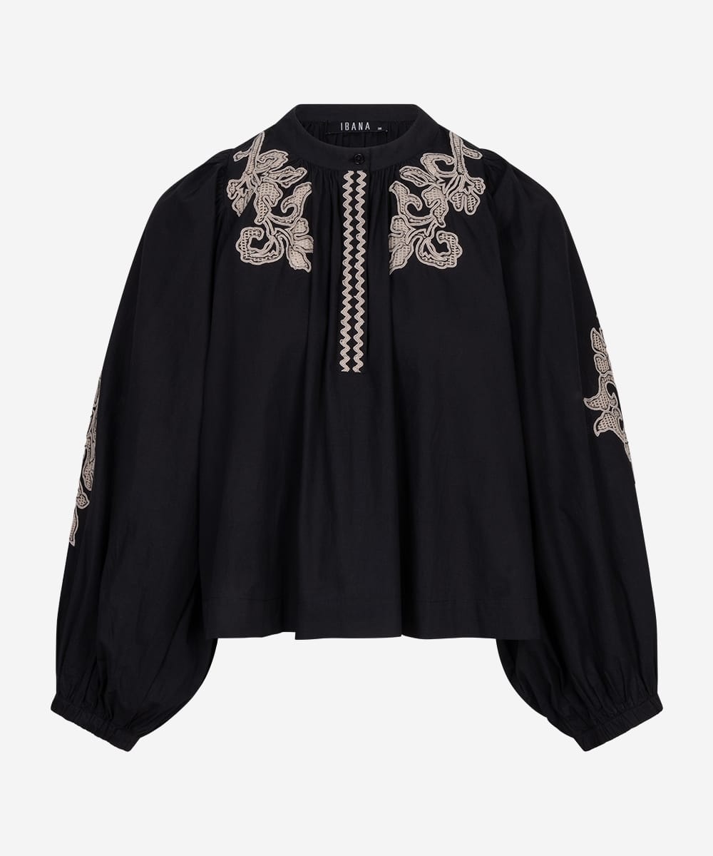 Wijde blouse van Ibana met lange pofmouwen, geborduurde details en een ronde hals voorzien van korte knoopsluiting. Materiaal: Katoen 100%