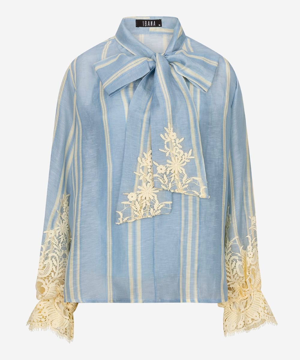Gestreepte linnen blouse van Ibana met lange mouwen voorzien van broderie accenten en een opstaande kraag voorzien van split en strikdetail.