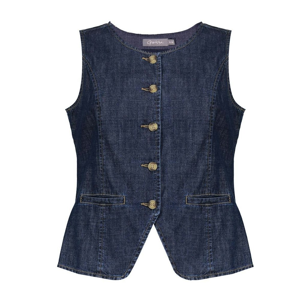 Getailleerd denim gilet van Geisha met een ronde hals, knoopsluiting, twee paspelzakken en een split aan de achterzijde. Materiaal: Katoen 100%