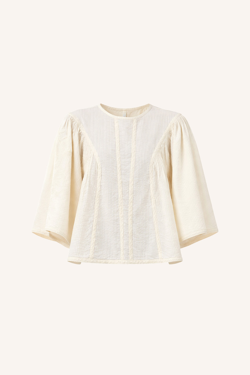 Seersucker blouse van By-Bar met driekwart wijde mouwen, geplooide details, ronde hals, subtiel borduurwerk en een keyhole voorzien van knoopsluiting aan de achterzijde.