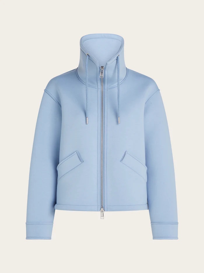 Kort jacket van Beaumont in scuba stof met een deelbare ritssluiting, opstaande kraag voorzien van trekkoord en steekzakken.