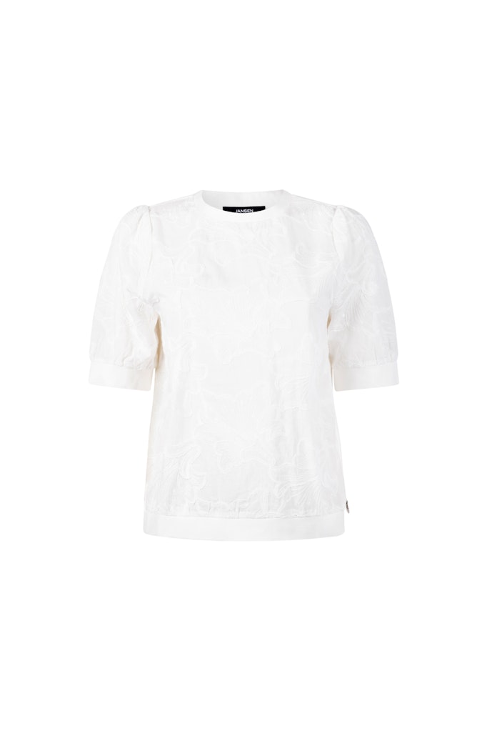 Top van Jansen Amsterdam met 3D bloemenprint, korte mouwen, ronde hals en stretchboorden. Materiaal: Katoen 100%