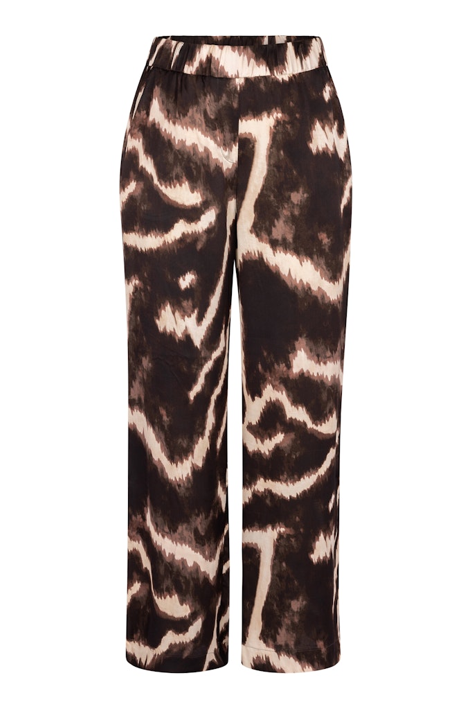 Broek van Studio Anneloes in een animal dessin met rechte wijde pijpen, elastische tailleband, riemlussen, steekzakken en paspelzakken achter.