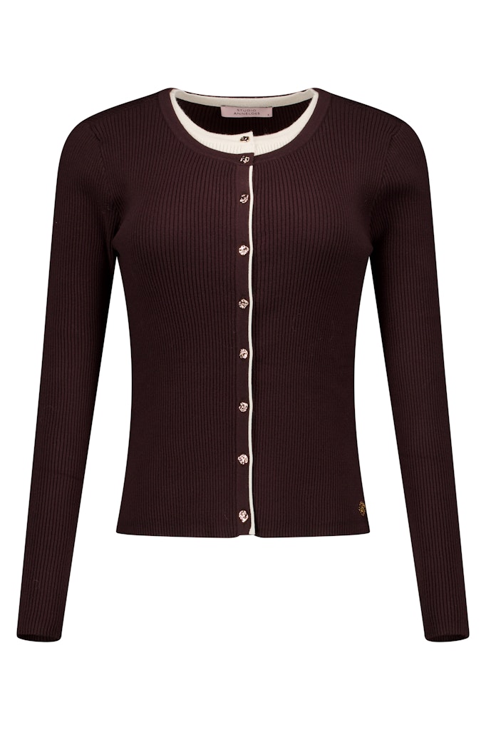 Vest van Studio Anneloes in een ribstructuur met subtiele contrasterende details, lange mouwen, ronde hals en een knoopsluiting. Materiaal: Viscose 72%| polyester 28%