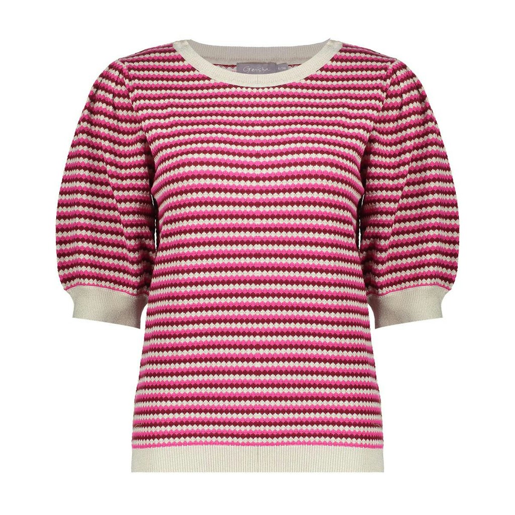 Gebreide trui van Geisha met ingebreide lurex strepen, korte raglanmouwen, ronde hals en ribgebreide boorden. Materiaal: Viscose 77%| polyamide 19%| metaal 4%