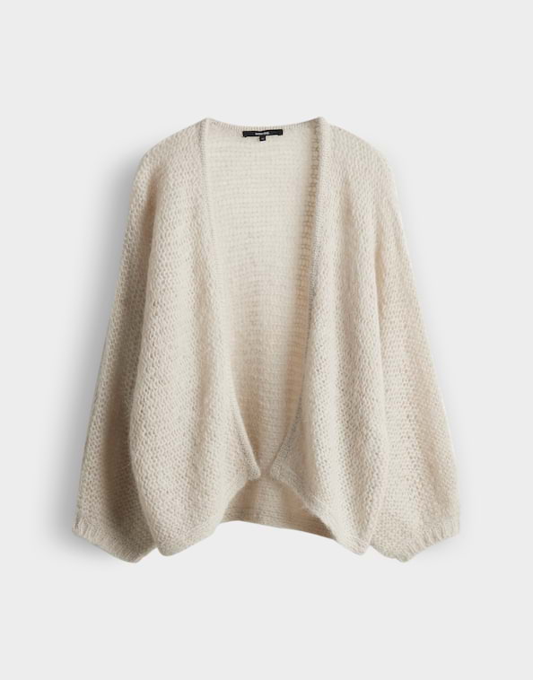 Openvallend, gebreid vest van Someday in een doorschijnend structuur met verkorte vleermuismouwen en een brede pasvosrm