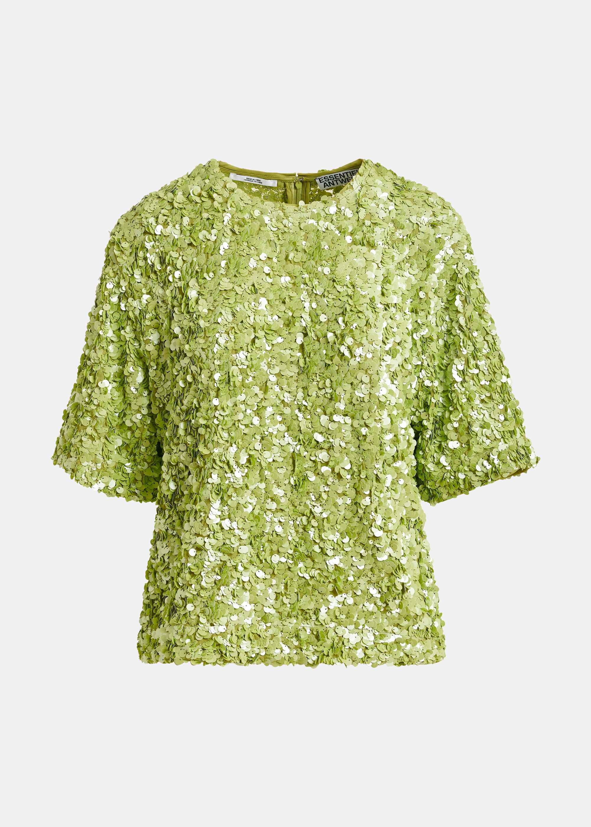 Oversized pailletten top van Essentiel Antwerp met korte mouwen, ronde hals en een verborgen ritssluiting aan de achterzijde.