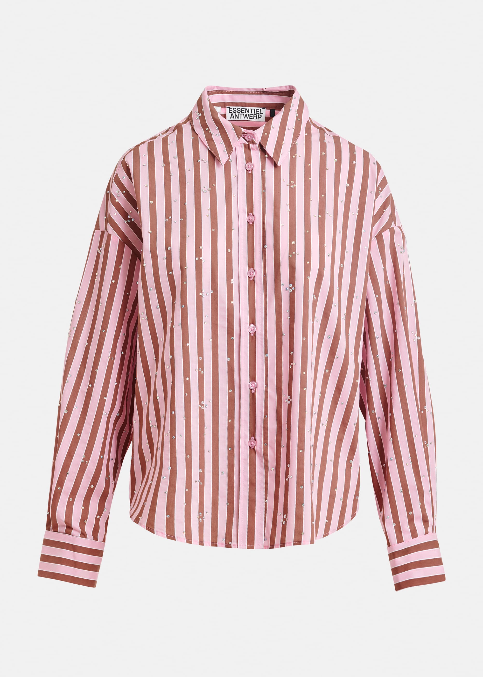 Gestreepte blouse van Essentiel Antwerp met strass steetjes, lange mouwen, verlaagde schoudernaden, klassieke kraag, knoopsluiting, iets langere achterzijde en afgeronde zoom. Materiaal: Katoen 85%| polyamide 15%