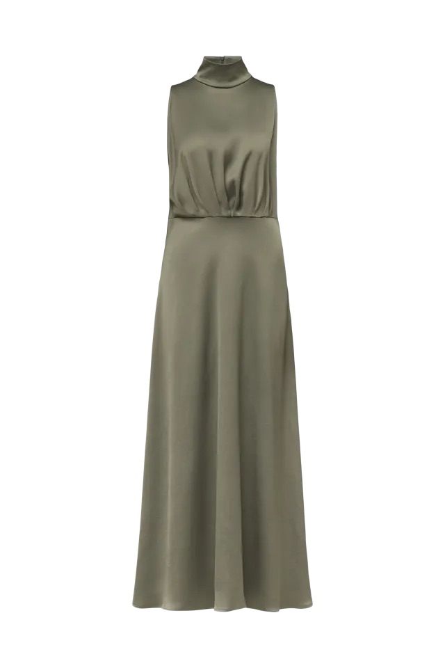Mouwloze satijnen A-lijn jurk van Drykorn met een turtleneck, geplooide taille en blinde ritssluiting aan de achterzijde.