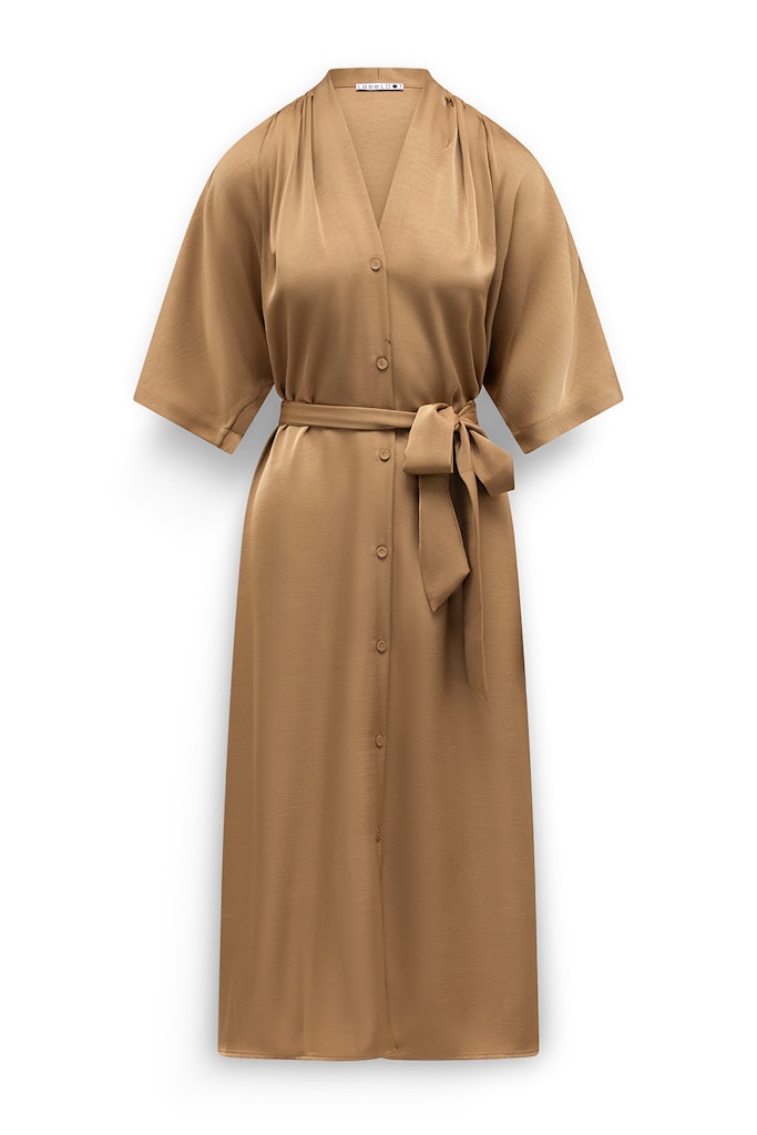 Satijnen jurk van Label Dot met driekwart wijde aangeknipte mouwen, V-hals, doorlopende knoopsluiting, zijsplitten en een strikceintuur in de taille. Materiaal: Acetaat 100%