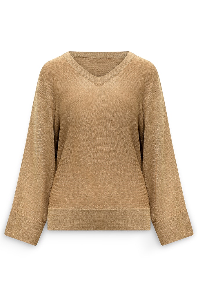 Lurex trui van Label Dot met lange vleermuismouwen, V-hals en ribgebreide boorden. Materiaal: Viscose 47%| acryl 44%| polyamide 5%| metaal fibre 4%