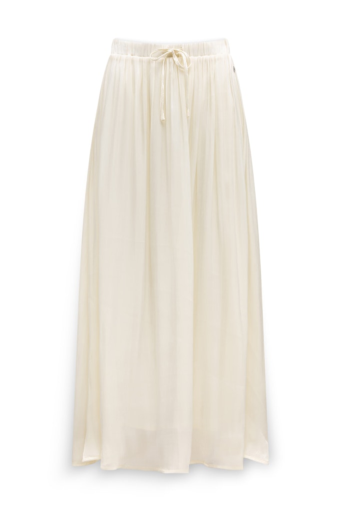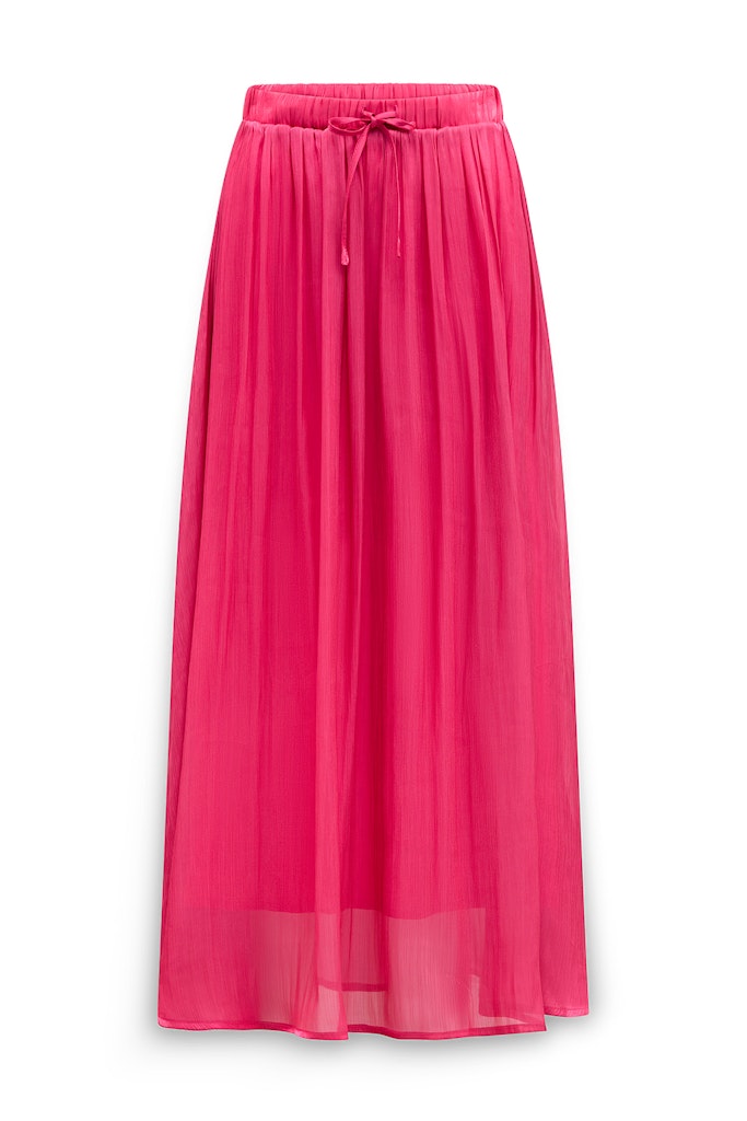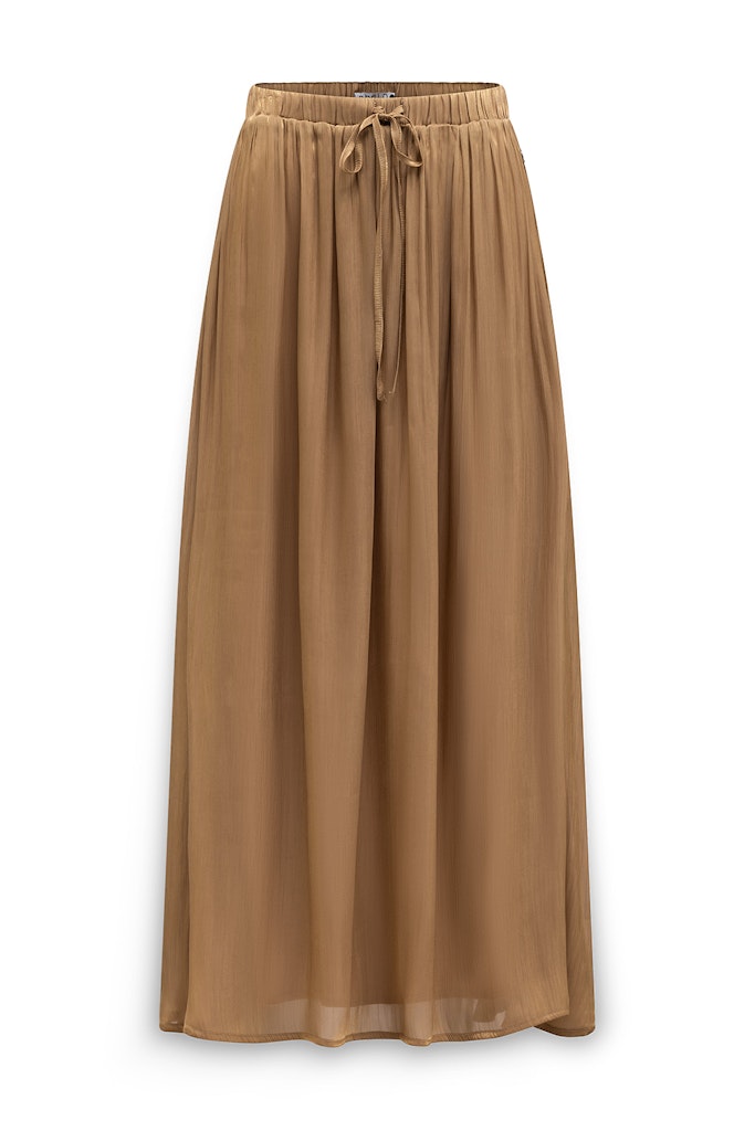 Glanzende maxi-rok van Label Dot in een crinkle stof met een elastische tailleband voorzien van strikkoord. Materiaal: Polyester 100%
