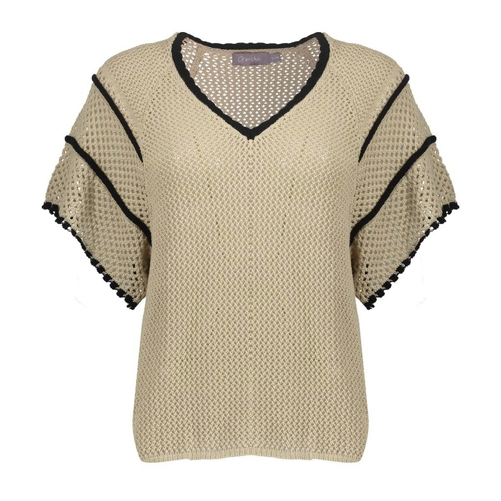 Opengewerkte trui van Geisha met korte wijde raglanmouwen, V-hals en contrasterende details. Materiaal: Katoen 50%| acryl 50%
