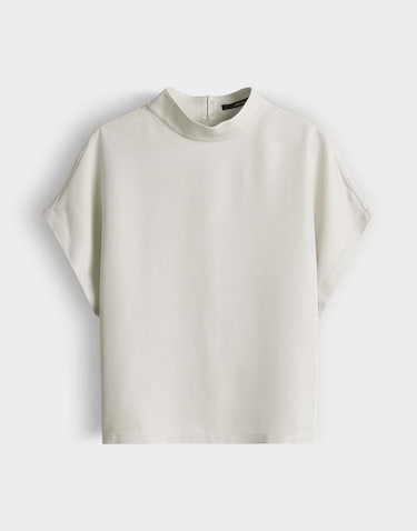Satijnen blouseshirt van Someday met korte aangeknipte mouwen, zijsplitten en een opstaande kraag voorzien van keyhole met dubbele knoopsluiting aan de achterzijde.