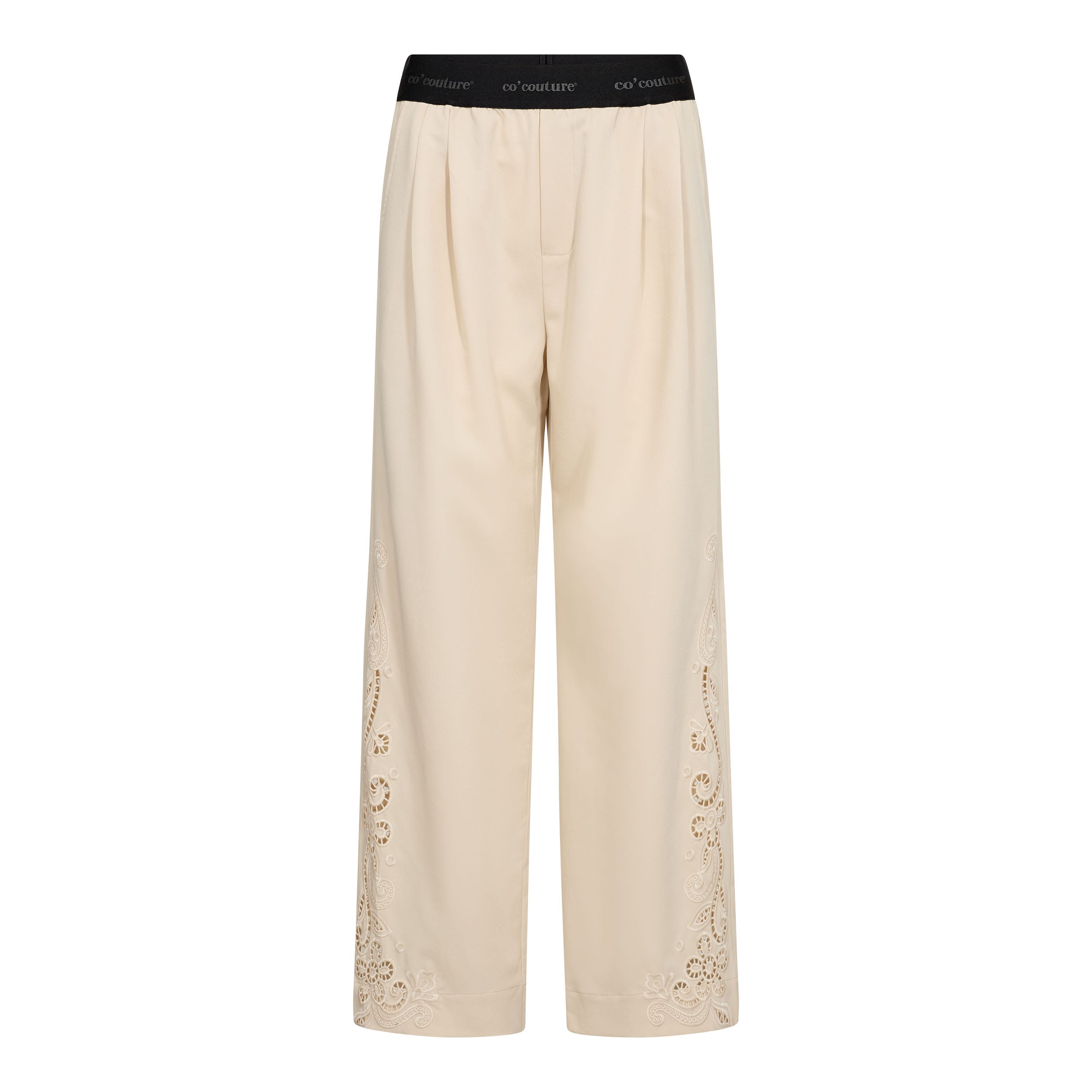 Broek van Co'Couture met wijde pijpen voorzien van broderie details aan de onderzijde, steekzakken, twee paspelzakken aan de achterzijde en een elastische tailleband voorzien van logo.
