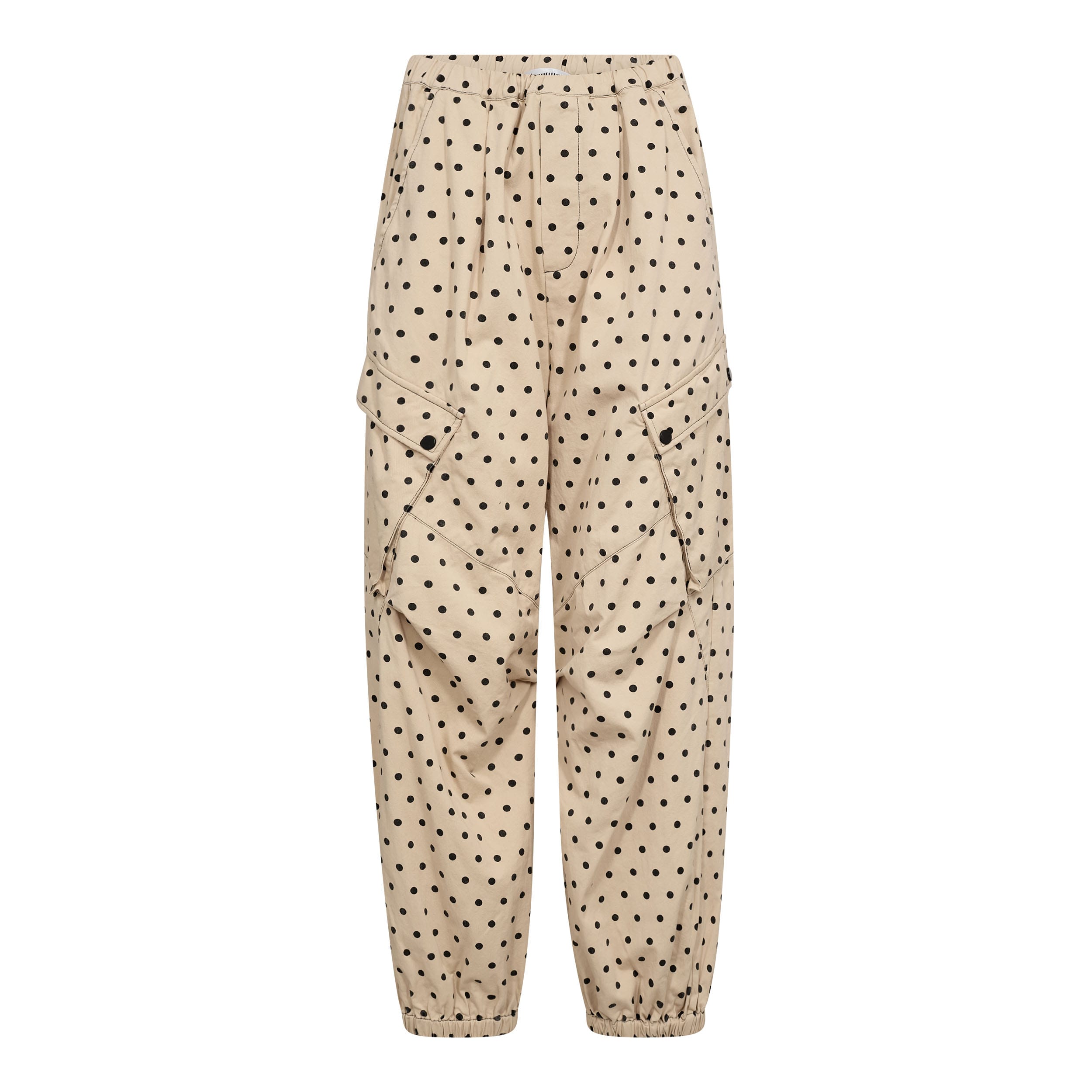 Cargo broek van Co'Couture in een stippen dessin met steekzakken, twee klepzakken aan de achterzijde, twee schuine klepzakken op de zijnaden, elastische tailleband en een elastische zoom in de pijpen