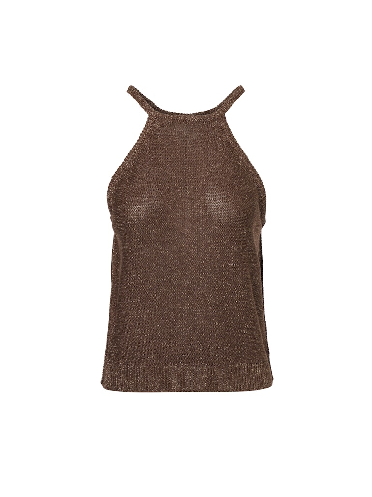 Mouwloze lurex top van Beaumont met dunne bandjes, keyhole voorzien van knoopsluiting aan de achterzijde en ribgebreide boorden.