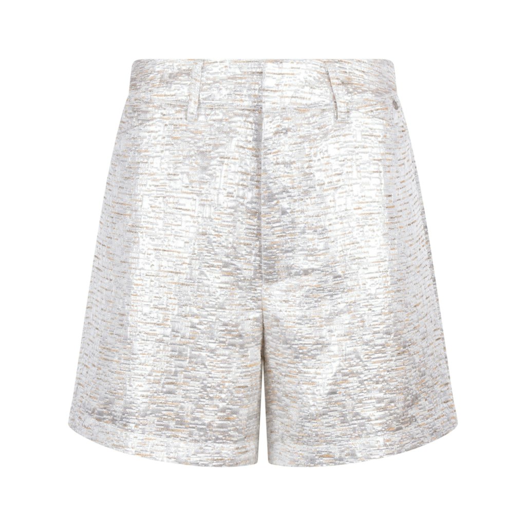 Glanzende short van Nukus in een all-over dessin met een verborgen knoop- en ritssluiting, elastiek aan de achterzijde en steekzakken. Materiaal: Polyester 62%| rayon 24%| lurex 14%