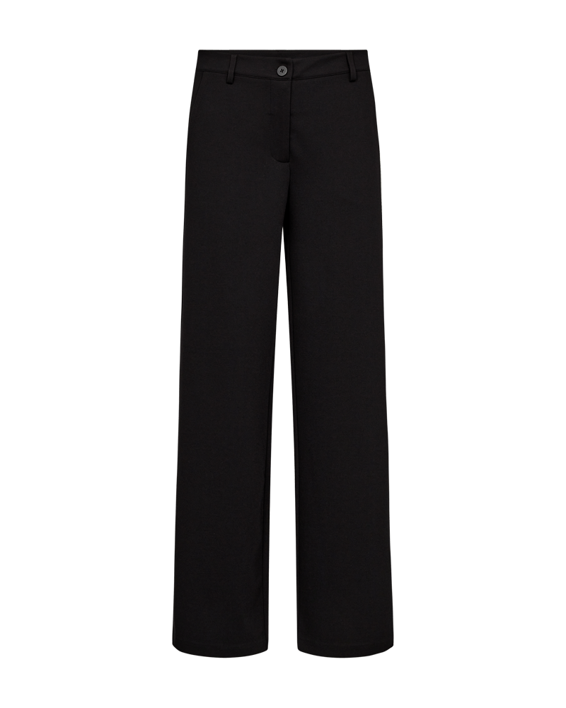 Broek van Freequent met wijde pijpen, knoop- en ritssluiting, steekzakken en twee paspelzakken aan de achterzijde. Materiaal: Polyester 73%| viscose 24%| elastan 3%
